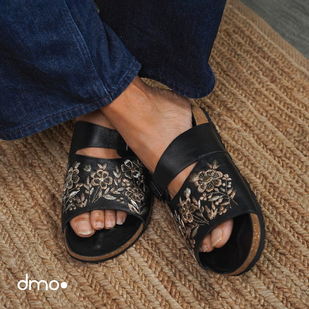 Introducing the 'Pelle Corko Nozzo,' a luxurious black cork slipper that combines celebration and style effortlessly. Crafted from super soft supple leather, this pair features exquisite hand-zardozi embroidery on the top panel, creating a truly celebratory and artistic design. Ideal for festive occasions and for those looking to make a statement, this slipper is the epitome of elegance and comfort.