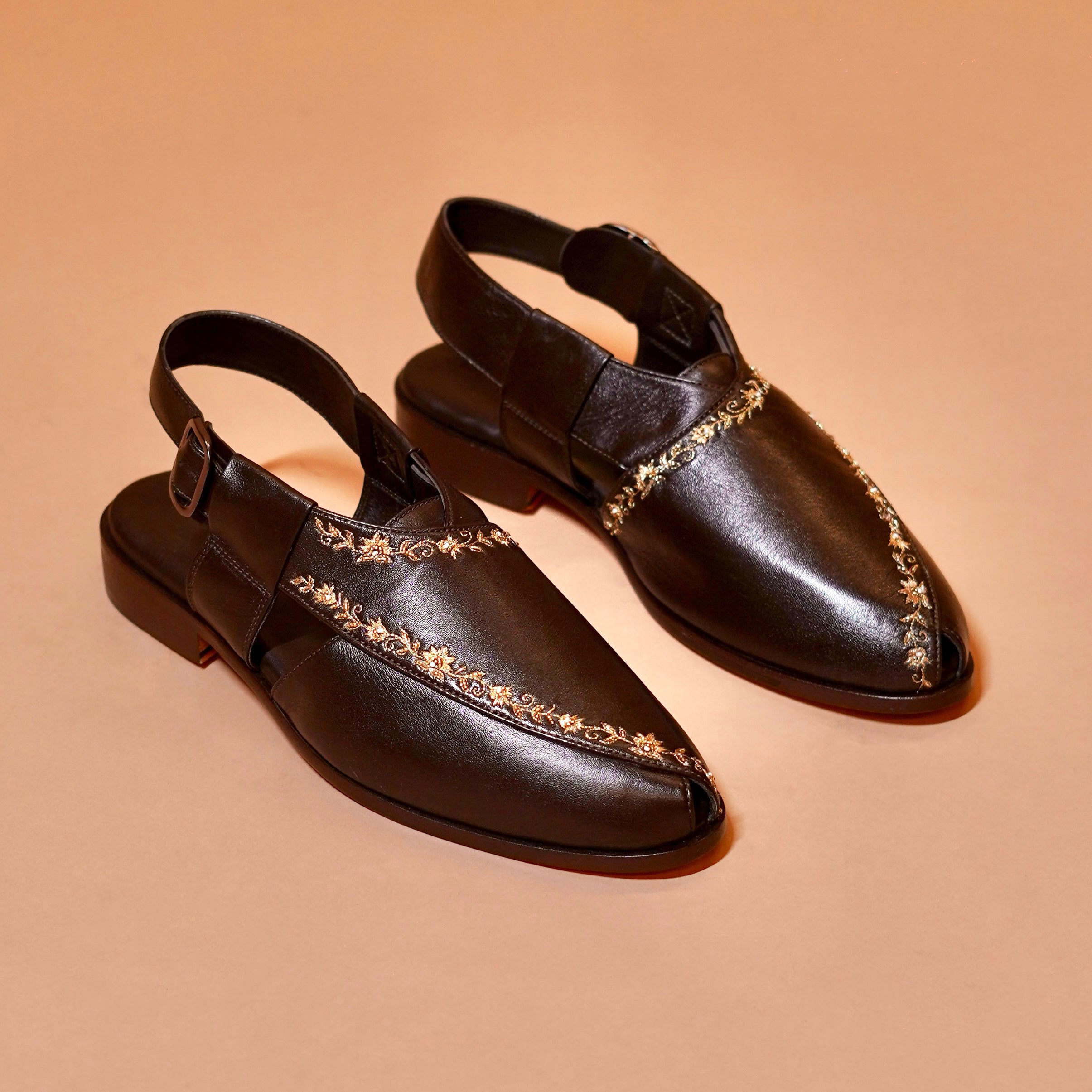 Pesha Ricamo Bruno is a refined take on the classic Peshawari silhouette, crafted in a rich dark brown leather finish. The design is elevated with subtle embroidery along the edges, adding depth and artisanal character without overpowering its traditional form. Blending heritage craftsmanship with a modern sensibility, this pair is designed for versatile wear across both casual and occasion settings.