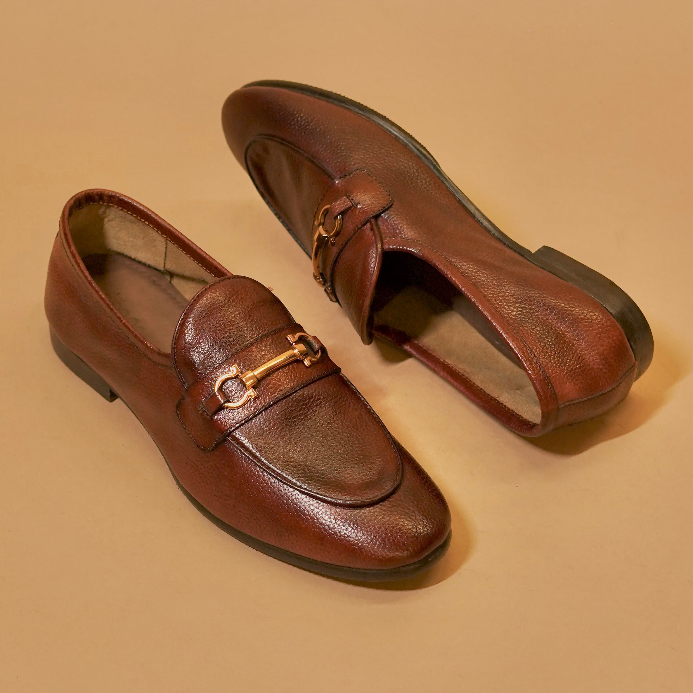Embrace classic charm with the Flexo Bruno Oro, our brown Ultra-Flex loafer crafted from premium milled leather and accented with a golden horse bit ornament. Designed for the discerning gentleman, these loafers feature a sleek leather sole and luxurious texture, making them a refined choice for both office wear and smart-casual occasions. The rich brown hue and elegant gold detailing elevate every step with timeless style.