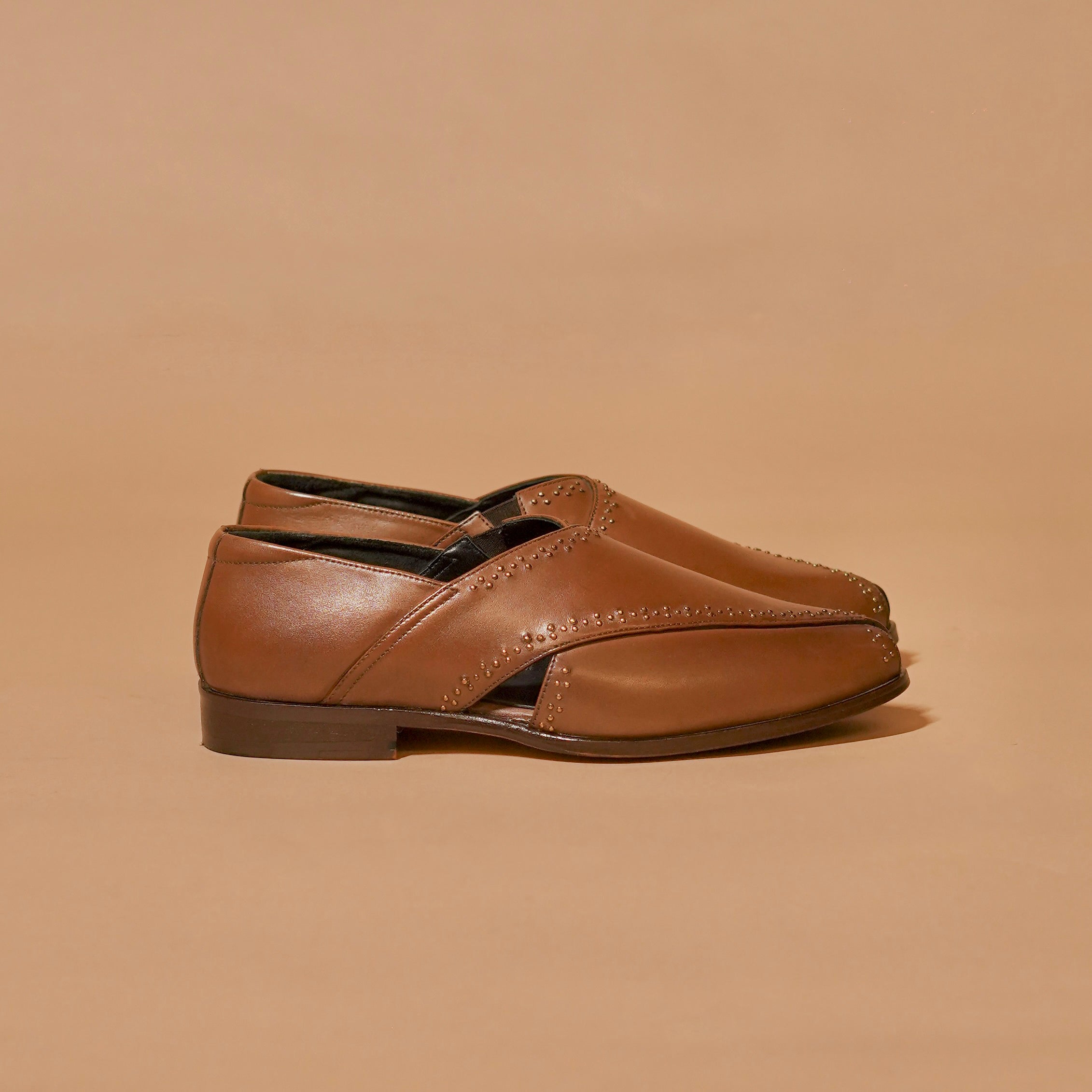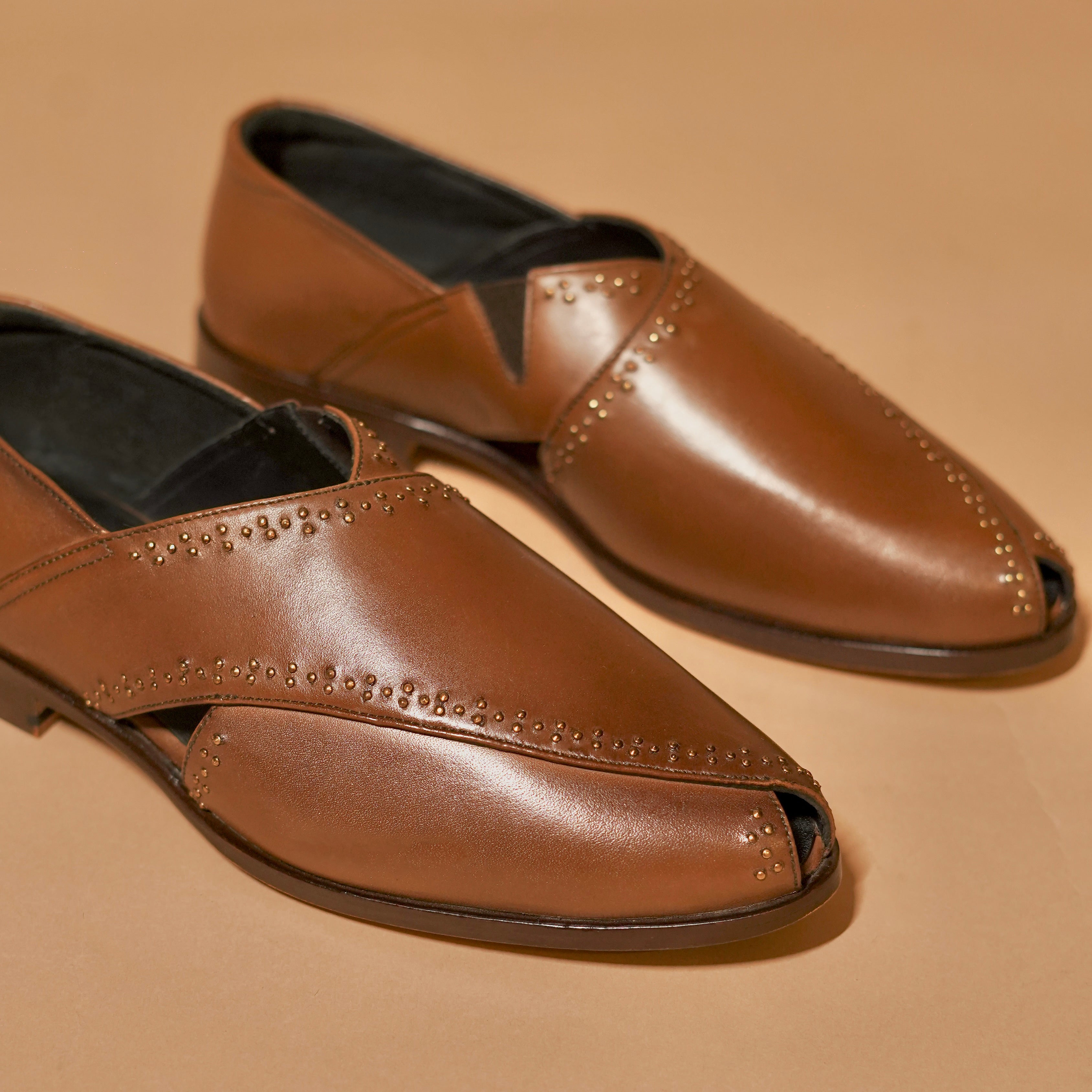 Pesha Rivetto is a contemporary take on the classic Peshawari silhouette, crafted for men who value tradition elevated through refined detailing. Made from premium dark brown leather, the shoe features a structured open construction with distinctive rivet accents along the edges, adding character and artisanal depth to the design.