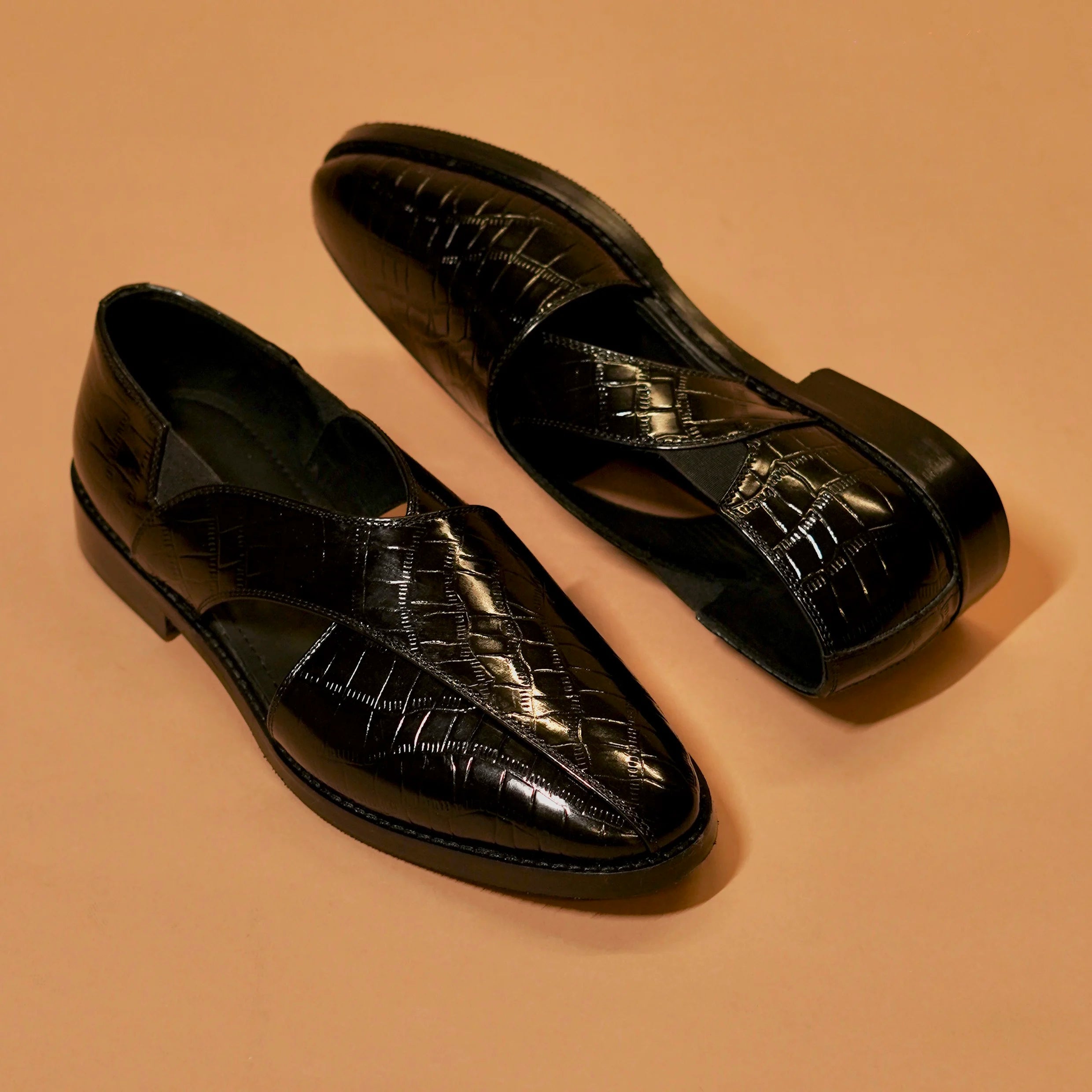 Pesha Croco – Black Crocodile-Embossed Leather Peshawari