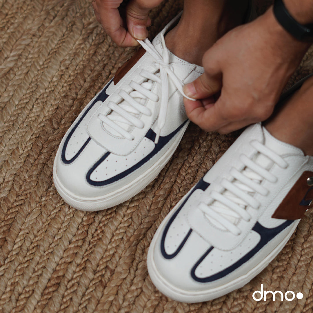 The Bianco Azzuro is more than just a sneaker — it's a statement in motion. Crafted in premium white leather with sharp blue suede panelling and dmodot’s signature burnt tan detailing, this sneaker fuses sport and style with a playful nod to design innovation.