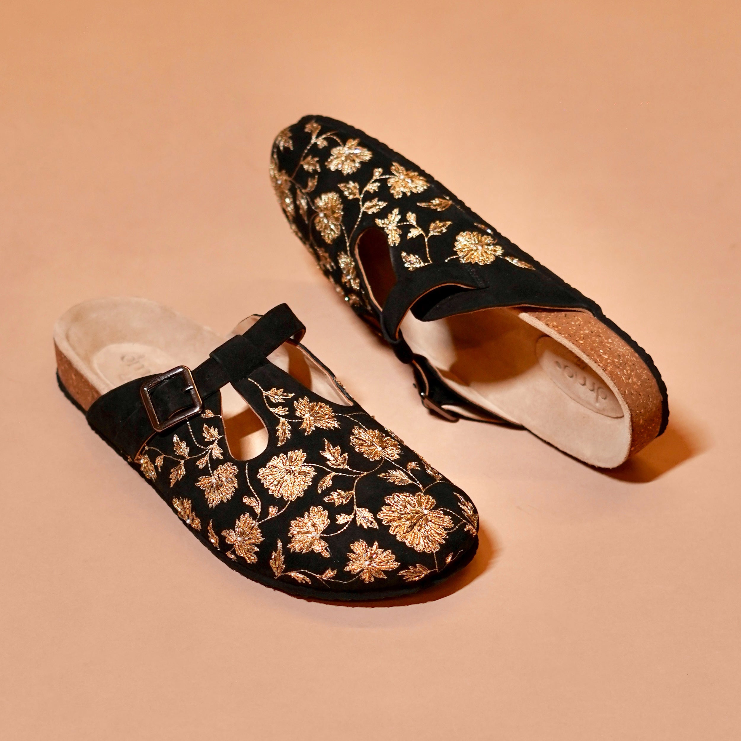 Hoffler Corko Ricamo Nero is a modern expression of relaxed luxury, crafted in a rich black suede finish. The upper features subtle embroidery that adds texture and artisanal character, enhancing the easy clog sandal silhouette. Set on a natural cork footbed, it offers lightweight comfort and everyday ease while maintaining a refined, contemporary appeal.