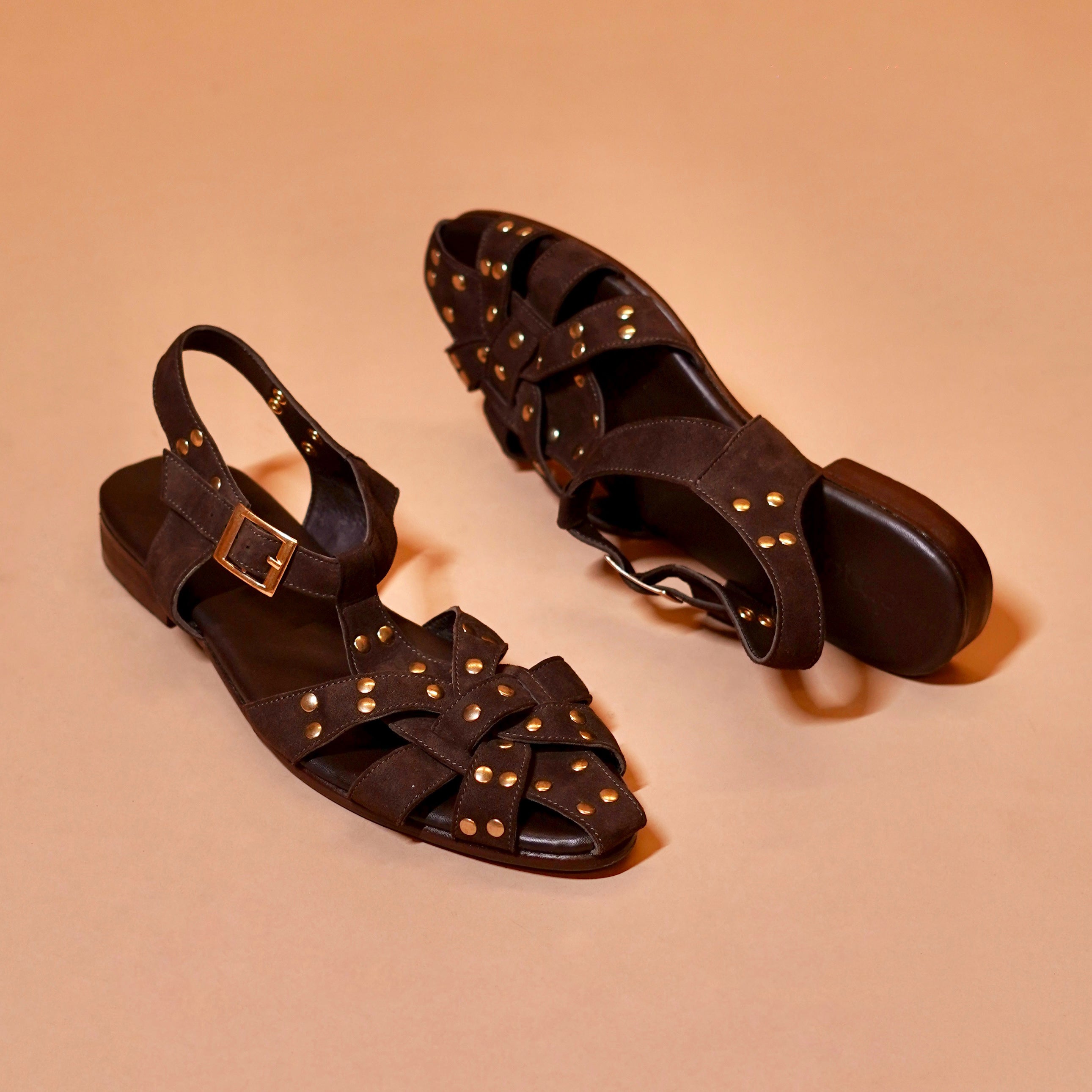 Pelle Bruno Rivo is crafted in rich dark brown leather, featuring layered strap detailing accented with metal rivets for a bold, structured look. The slingback design with an adjustable buckle ensures a secure fit, while the leather sole adds a refined touch along with everyday comfort. Blending rugged character with craftsmanship, it is designed for effortless, all-day wear.