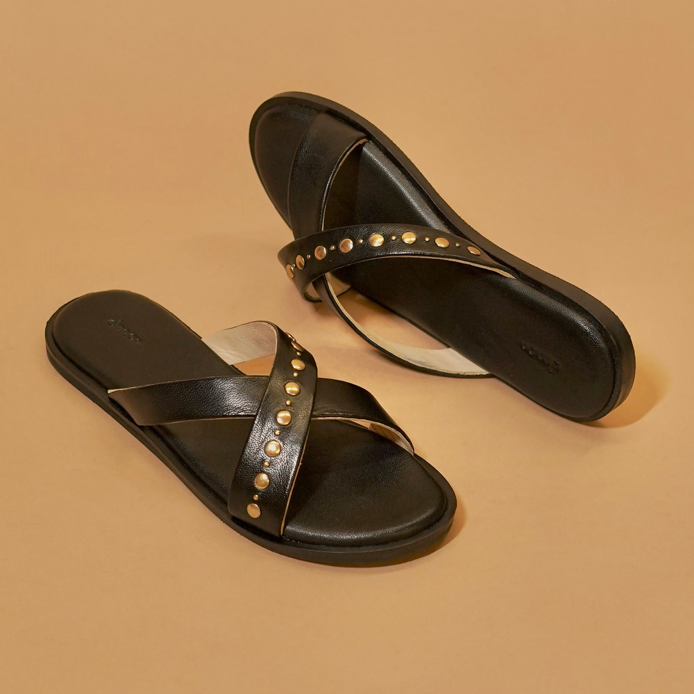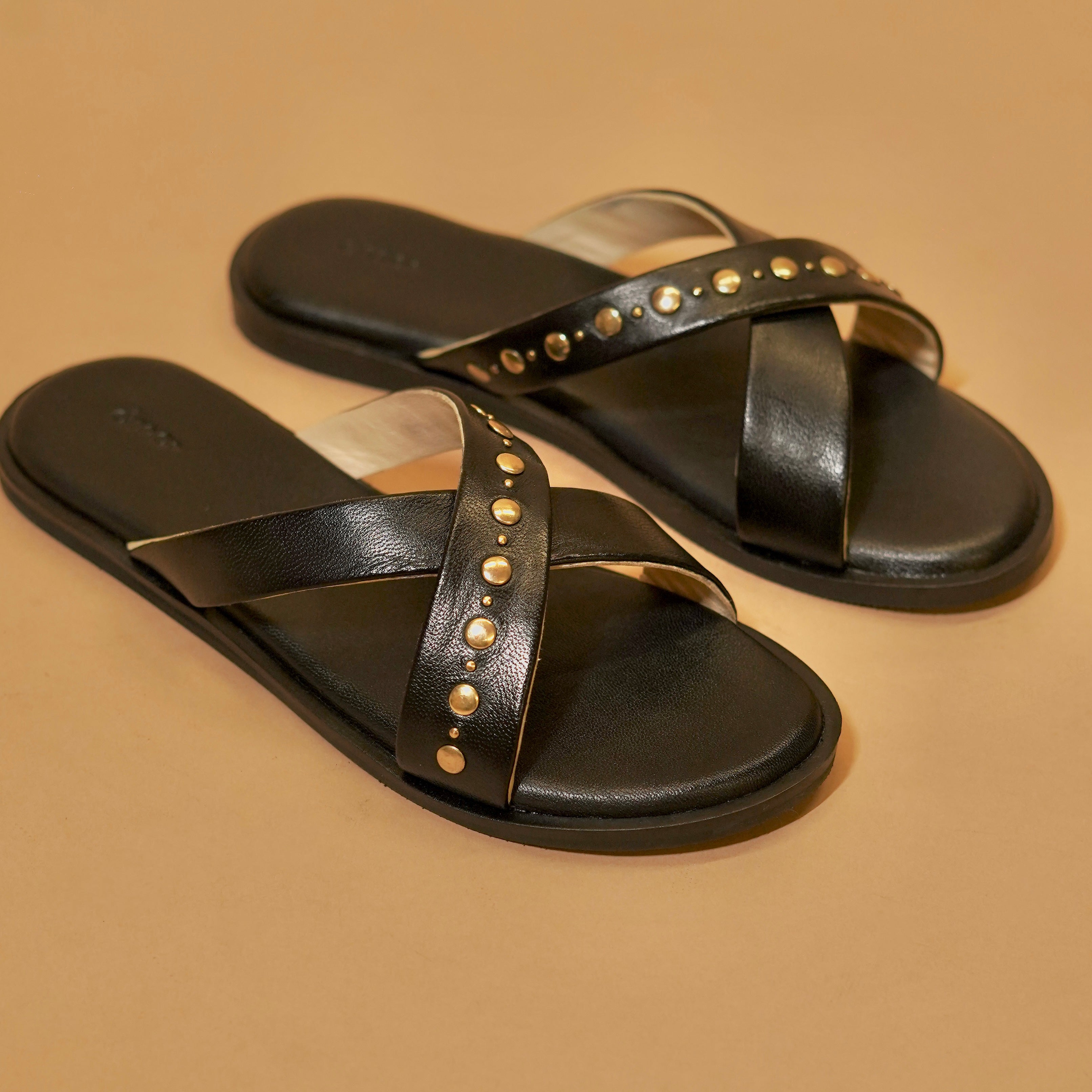 Refined. Edgy. Effortlessly cool. Pelle Incrocio’s black crossover straps are layered with metallic rivets that add depth and texture to your step. It’s the pair that transitions seamlessly from statement workwear to late-night plans.