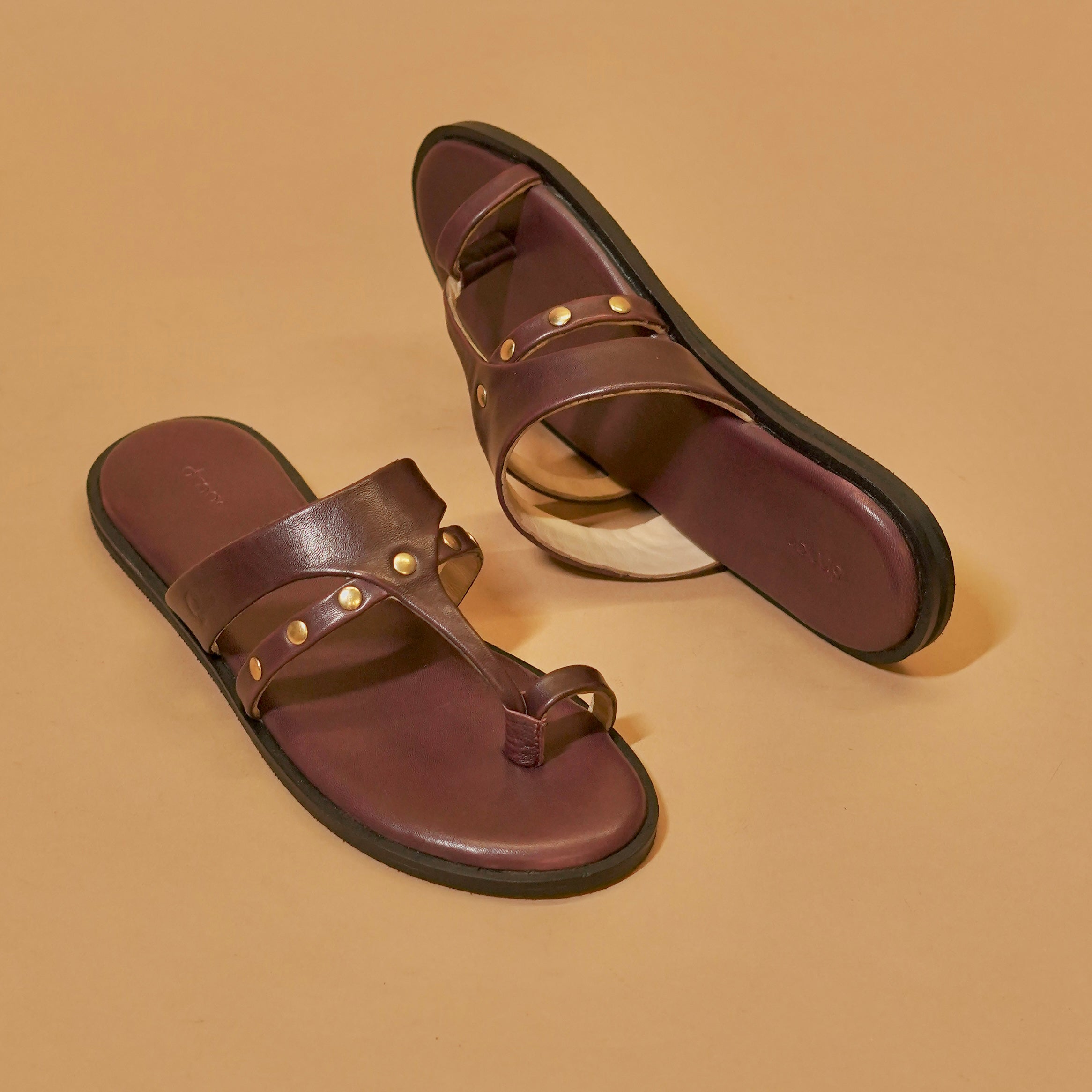 Vintage elegance meets contemporary ease with Pelle Pruno, a women’s leather Chappals that brings personality and polish to everyday style. Rendered in a rich plum hue and accented with antique rivets, it walks the line between classic design and modern flair. The open silhouette and structured straps allow breathability and comfort — perfect for sunny brunches, city strolls, or weekend lounging.