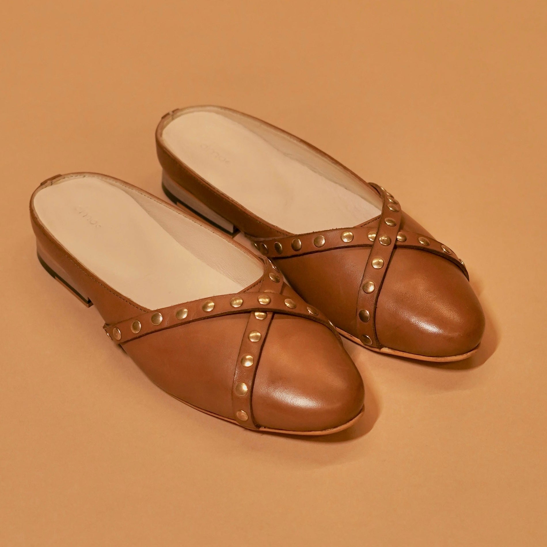 Riva Terra is a sophisticated brown leather mule designed for effortless elegance. Featuring sleek cross straps that sit beautifully across the foot, this style is elevated with a refined rivet accent that adds a subtle yet striking detail.